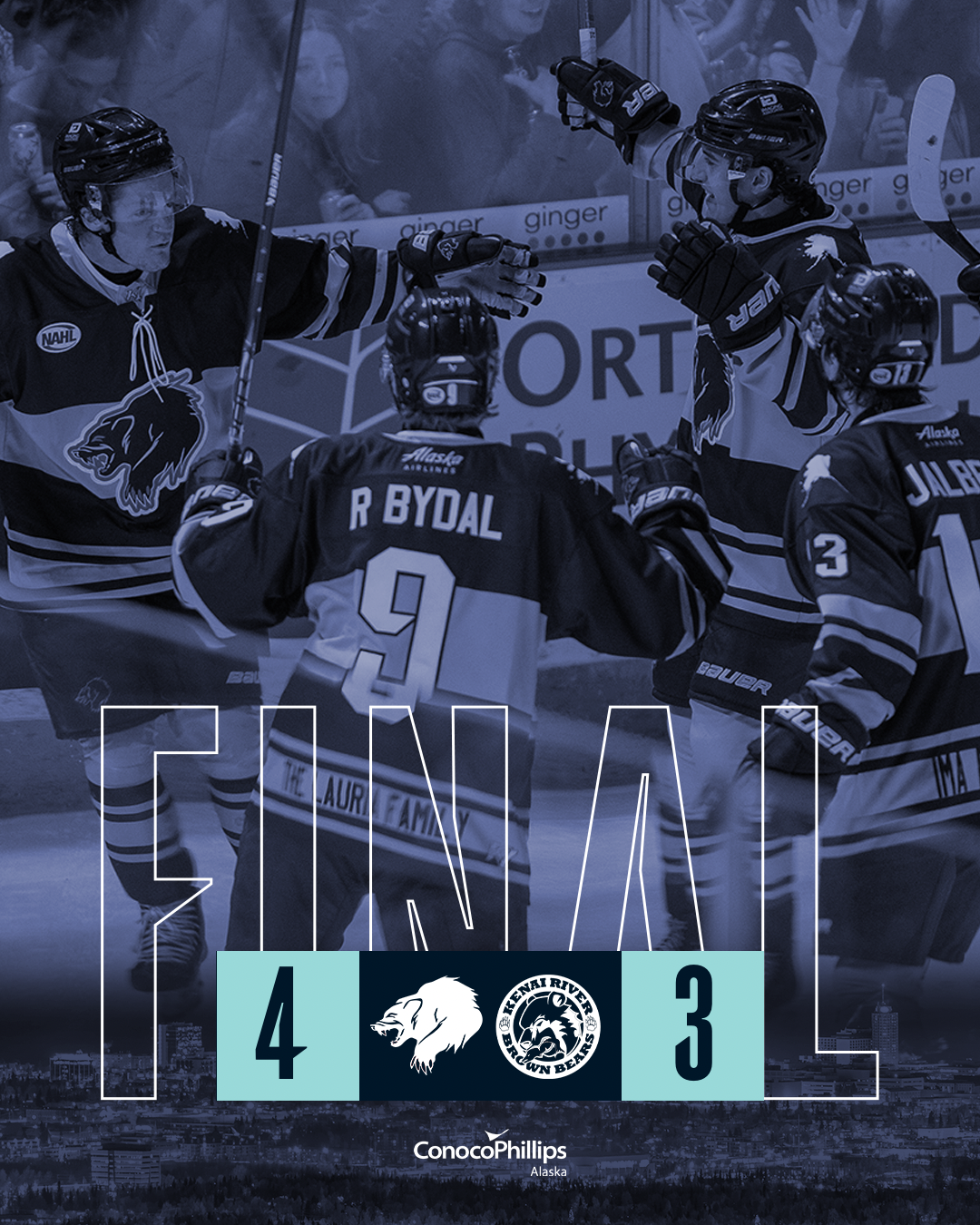 With just over five minutes remaining in regulation, Luc Bydal buried his 10th of the season to seal the win and improve Anchorage’s record to 5-8-1-1.