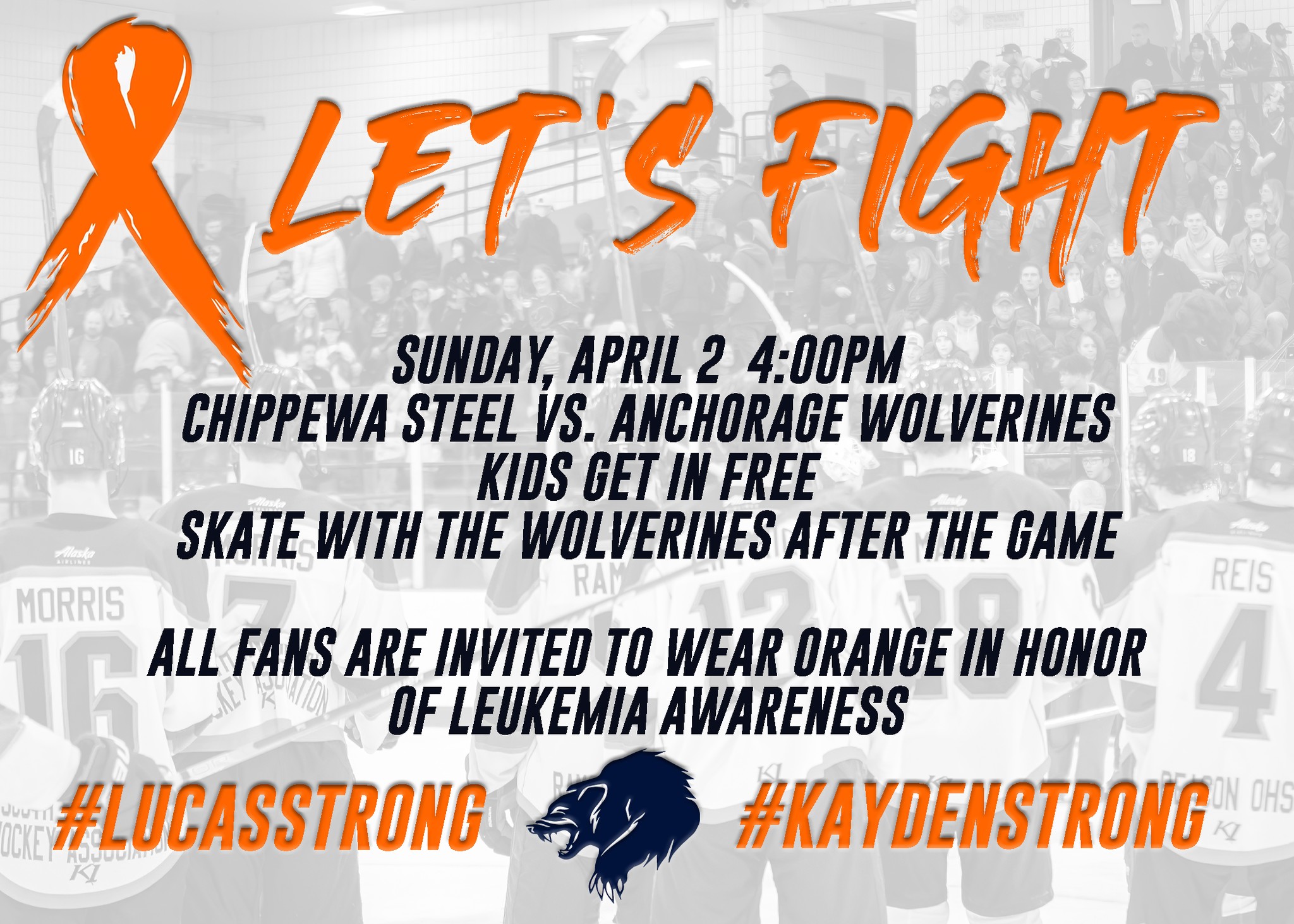 While this point of the NAHL regular season is undoubtedly important to the Anchorage Wolverines, some things are bigger than hockey. Recently two Wolverines fans were diagnosed with Acute Lymphoblastic Leukemia, and for that reason, the organization invites all fans attending Sunday’s game against the Chippewa Steel to wear orange in honor of leukemia awareness.