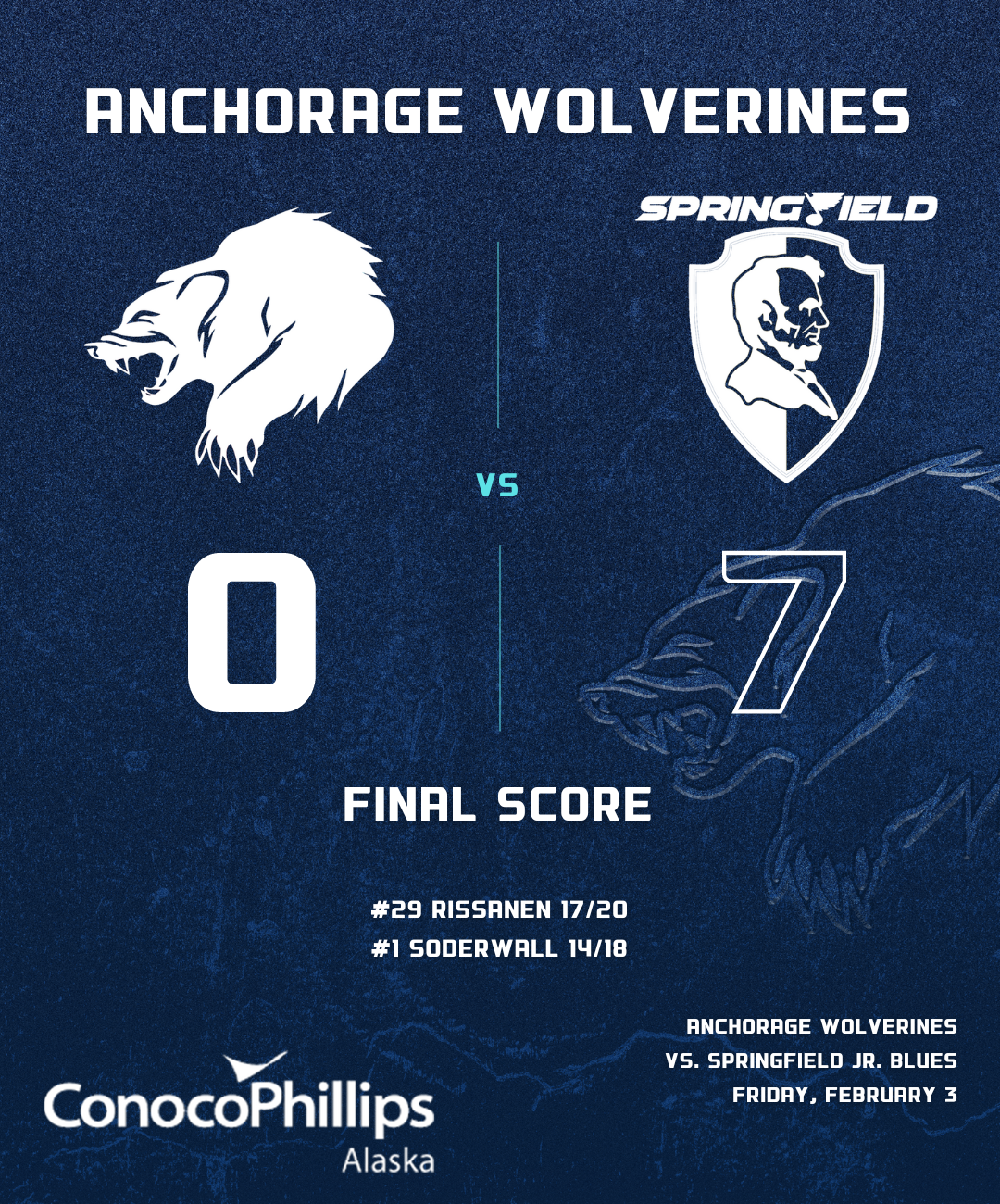 Things started poorly for Anchorage when Springfield scored five minutes into the 1st period, and they didn’t get much better as the night went on. The Jr. Blues scored twice more in the opening frame to go up 3-0, and then tacked on three more goals in the 2nd period. With one more added on late in the final frame for good measure, Springfield won decisively, by a final score of 7-0.